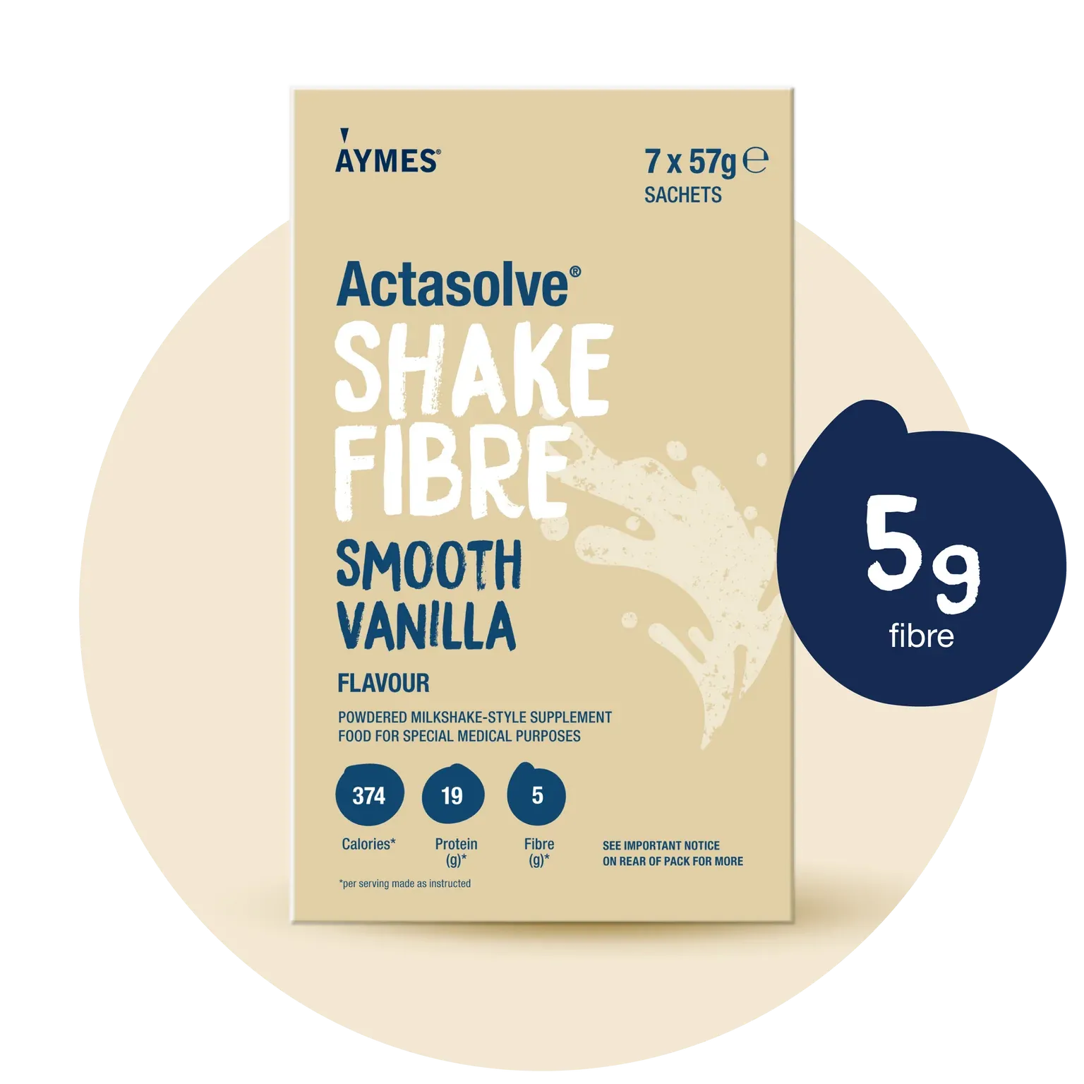 Actasolve Shake Fibre is a Food for Special Medical Purposes. It is a high protein, high fibre powdered oral nutritional supplement. Each 57g sachet provides 374 kcal with 19g of high-quality milk protein and 5.0g of fibre when reconstituted with 200ml whole milk.